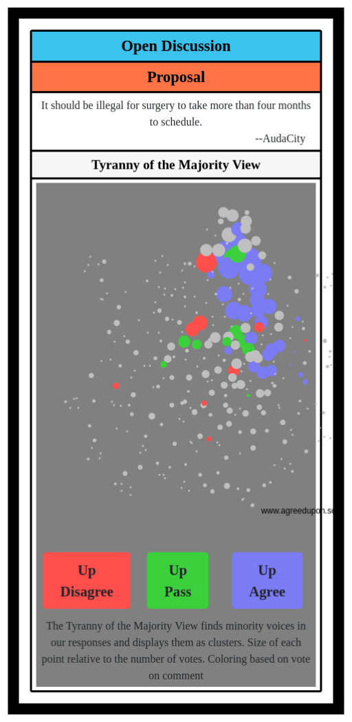 The Tyranny of the Majority View finds minority voices in our responses and displays them as clusters. Size of each point relative to the number of votes. Coloring based on vote on comment