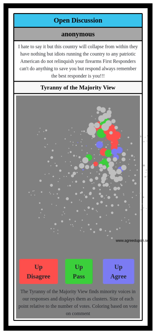 The Tyranny of the Majority View finds minority voices in our responses and displays them as clusters. Size of each point relative to the number of votes. Coloring based on vote on comment