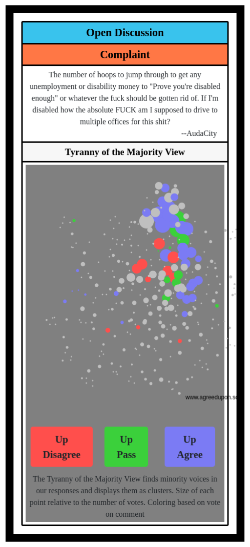The Tyranny of the Majority View finds minority voices in our responses and displays them as clusters. Size of each point relative to the number of votes. Coloring based on vote on comment