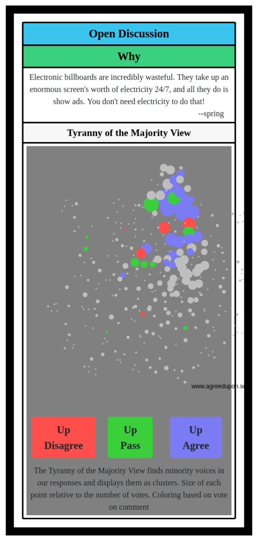The Tyranny of the Majority View finds minority voices in our responses and displays them as clusters. Size of each point relative to the number of votes. Coloring based on vote on comment