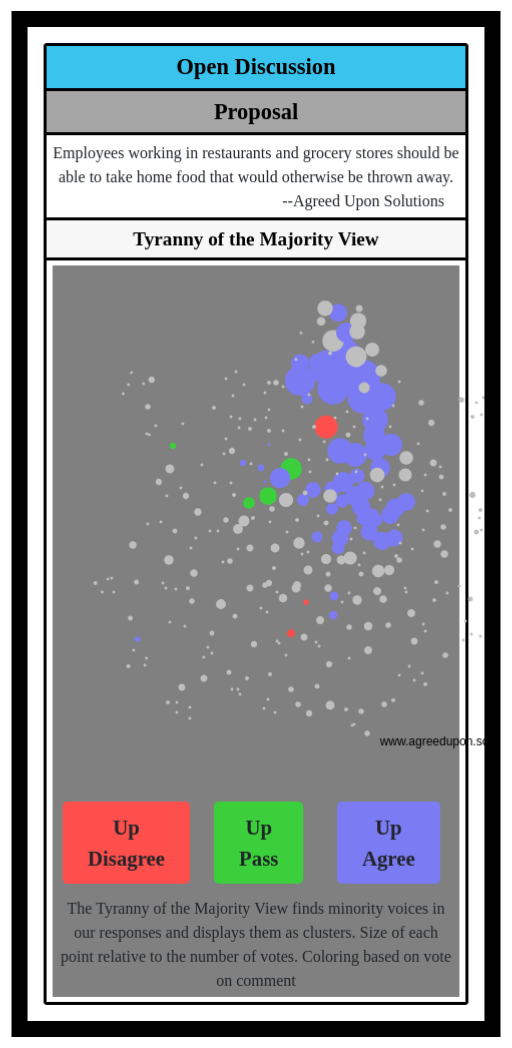The Tyranny of the Majority View finds minority voices in our responses and displays them as clusters. Size of each point relative to the number of votes. Coloring based on vote on comment