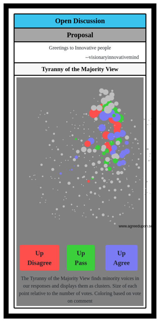 The Tyranny of the Majority View finds minority voices in our responses and displays them as clusters. Size of each point relative to the number of votes. Coloring based on vote on comment