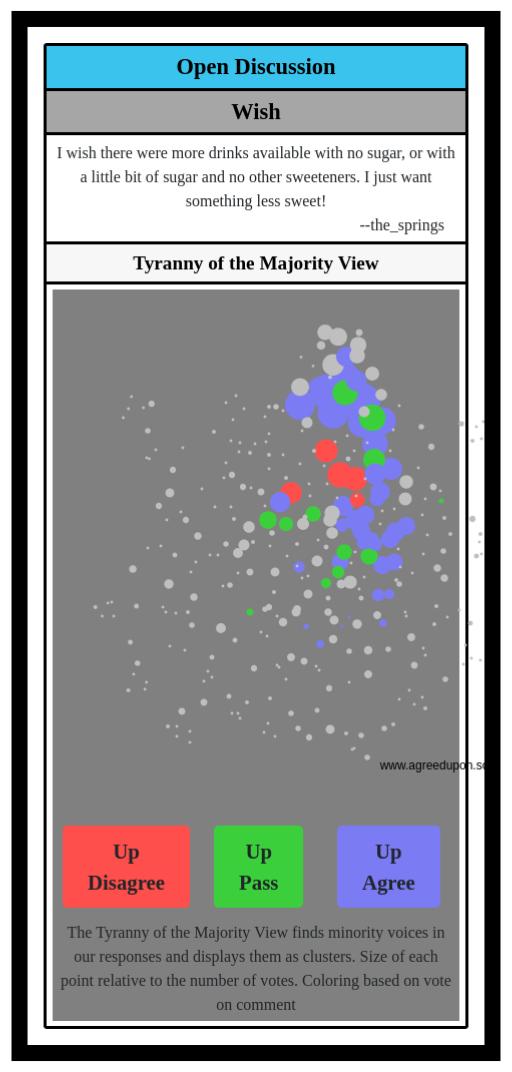The Tyranny of the Majority View finds minority voices in our responses and displays them as clusters. Size of each point relative to the number of votes. Coloring based on vote on comment