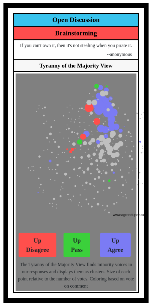 The Tyranny of the Majority View finds minority voices in our responses and displays them as clusters. Size of each point relative to the number of votes. Coloring based on vote on comment