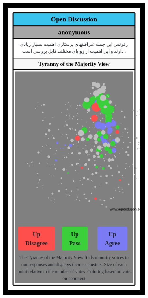 The Tyranny of the Majority View finds minority voices in our responses and displays them as clusters. Size of each point relative to the number of votes. Coloring based on vote on comment