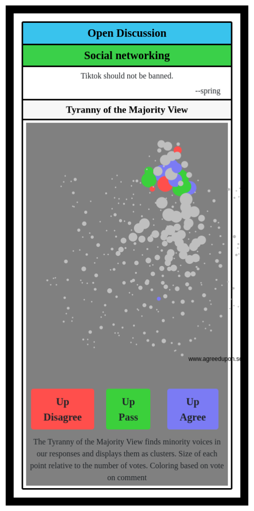 The Tyranny of the Majority View finds minority voices in our responses and displays them as clusters. Size of each point relative to the number of votes. Coloring based on vote on comment