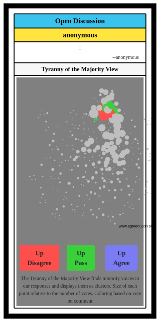 The Tyranny of the Majority View finds minority voices in our responses and displays them as clusters. Size of each point relative to the number of votes. Coloring based on vote on comment