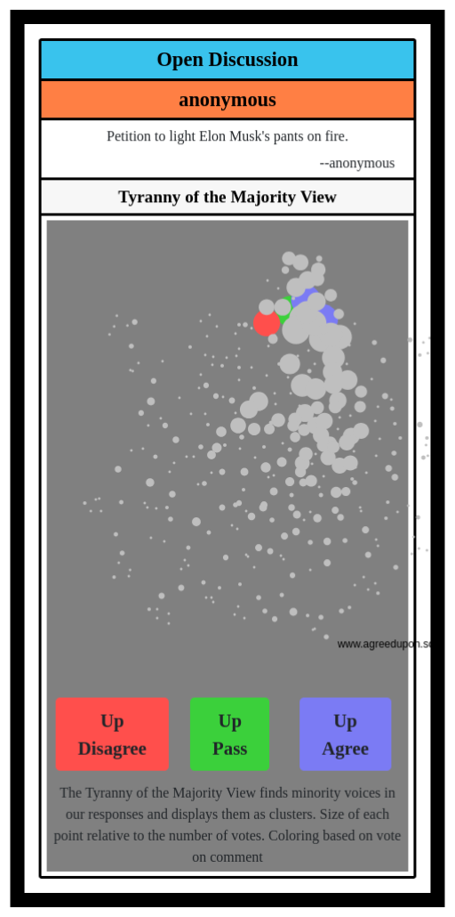 The Tyranny of the Majority View finds minority voices in our responses and displays them as clusters. Size of each point relative to the number of votes. Coloring based on vote on comment
