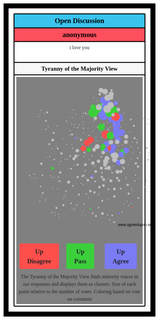 The Tyranny of the Majority View finds minority voices in our responses and displays them as clusters. Size of each point relative to the number of votes. Coloring based on vote on comment