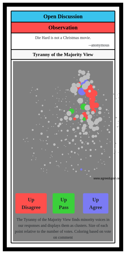 The Tyranny of the Majority View finds minority voices in our responses and displays them as clusters. Size of each point relative to the number of votes. Coloring based on vote on comment