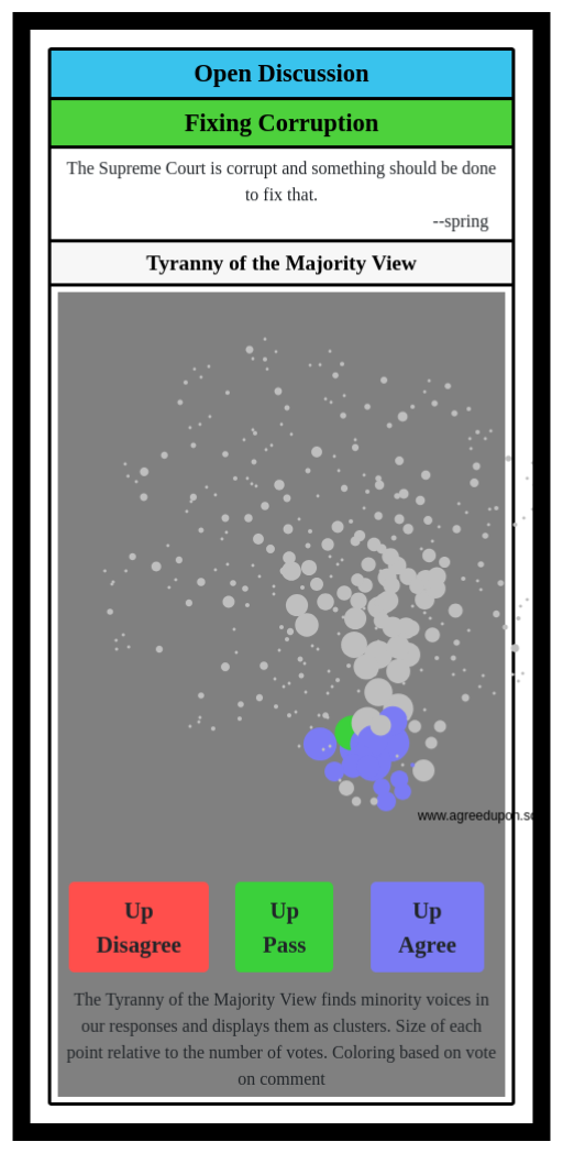 The Tyranny of the Majority View finds minority voices in our responses and displays them as clusters. Size of each point relative to the number of votes. Coloring based on vote on comment