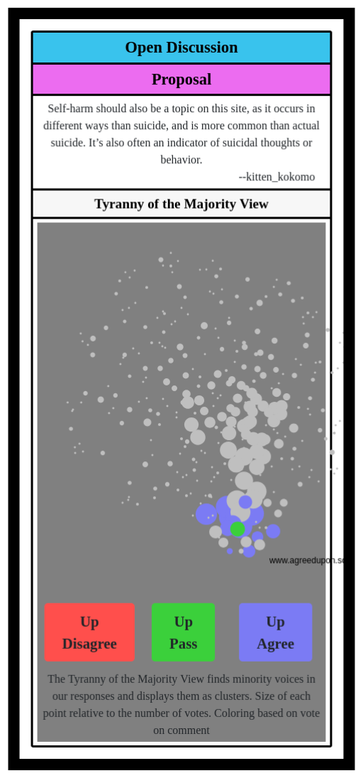 The Tyranny of the Majority View finds minority voices in our responses and displays them as clusters. Size of each point relative to the number of votes. Coloring based on vote on comment