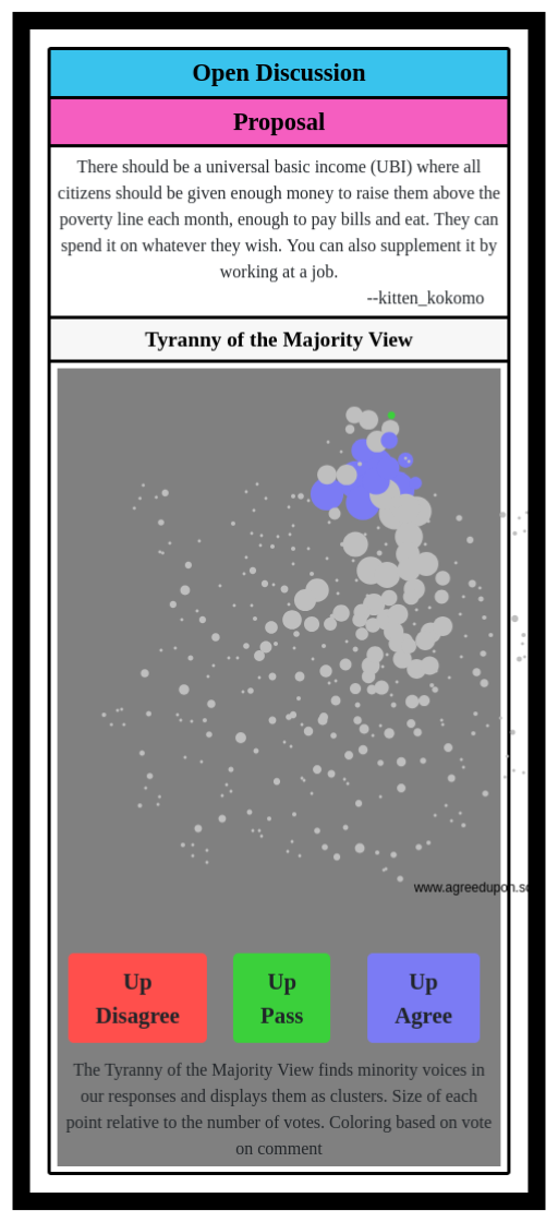 The Tyranny of the Majority View finds minority voices in our responses and displays them as clusters. Size of each point relative to the number of votes. Coloring based on vote on comment