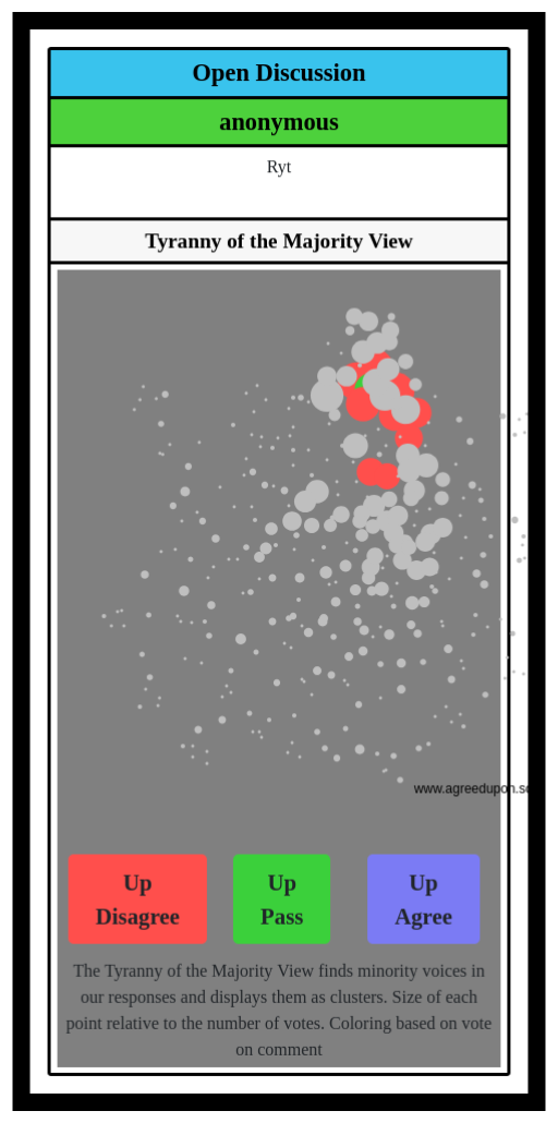 The Tyranny of the Majority View finds minority voices in our responses and displays them as clusters. Size of each point relative to the number of votes. Coloring based on vote on comment