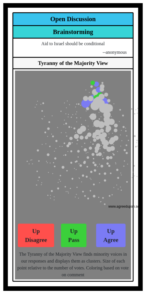 The Tyranny of the Majority View finds minority voices in our responses and displays them as clusters. Size of each point relative to the number of votes. Coloring based on vote on comment