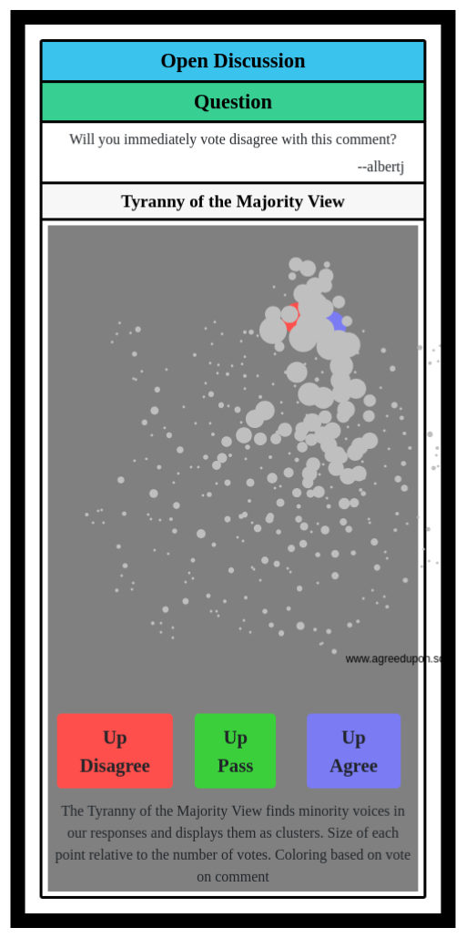 The Tyranny of the Majority View finds minority voices in our responses and displays them as clusters. Size of each point relative to the number of votes. Coloring based on vote on comment