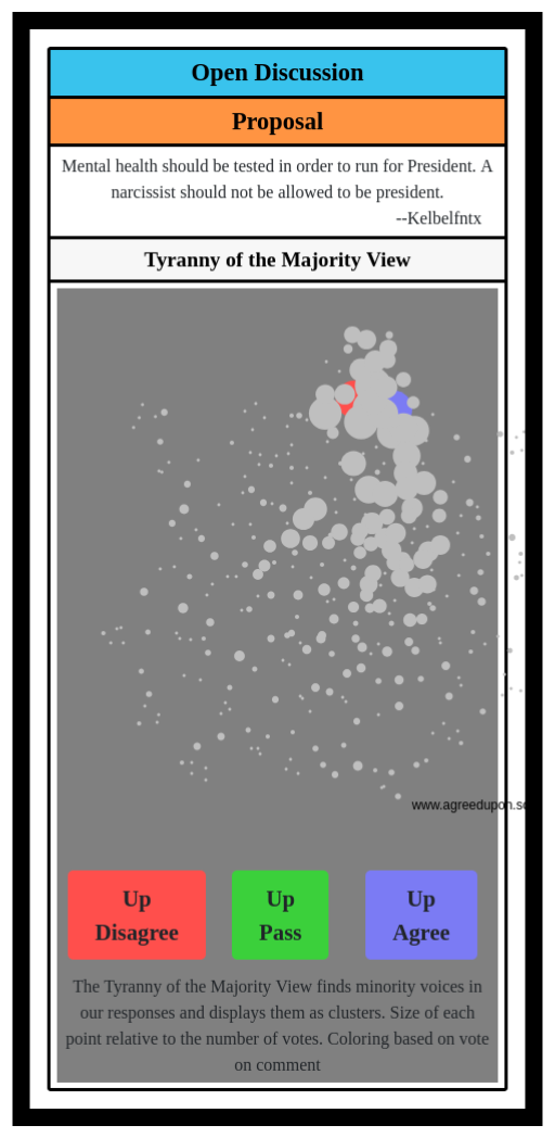The Tyranny of the Majority View finds minority voices in our responses and displays them as clusters. Size of each point relative to the number of votes. Coloring based on vote on comment