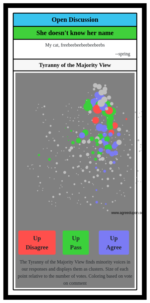 The Tyranny of the Majority View finds minority voices in our responses and displays them as clusters. Size of each point relative to the number of votes. Coloring based on vote on comment