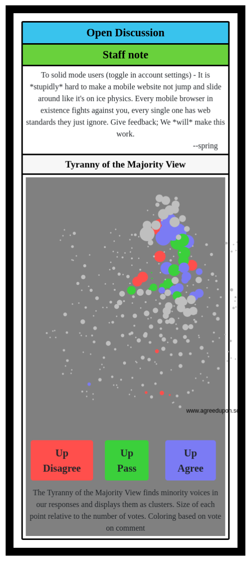 The Tyranny of the Majority View finds minority voices in our responses and displays them as clusters. Size of each point relative to the number of votes. Coloring based on vote on comment