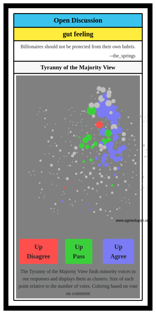 The Tyranny of the Majority View finds minority voices in our responses and displays them as clusters. Size of each point relative to the number of votes. Coloring based on vote on comment
