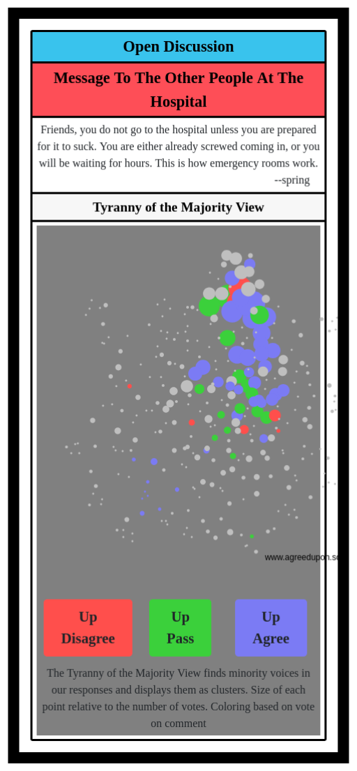 The Tyranny of the Majority View finds minority voices in our responses and displays them as clusters. Size of each point relative to the number of votes. Coloring based on vote on comment