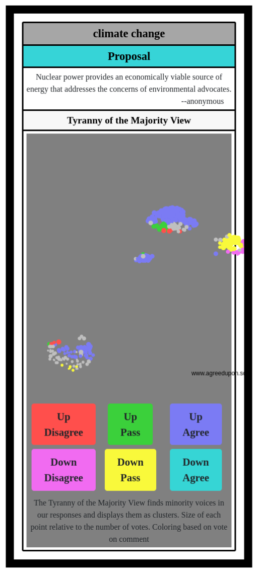 The Tyranny of the Majority View finds minority voices in our responses and displays them as clusters. Size of each point relative to the number of votes. Coloring based on vote on comment