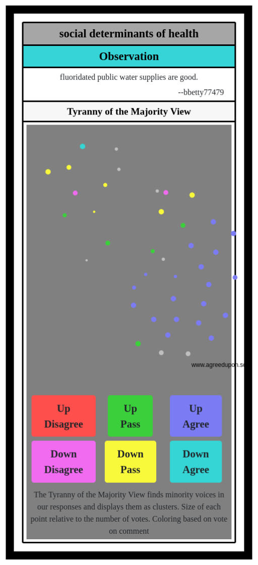 The Tyranny of the Majority View finds minority voices in our responses and displays them as clusters. Size of each point relative to the number of votes. Coloring based on vote on comment