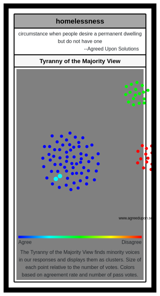 The Tyranny of the Majority View finds minority voices in our responses and displays them as clusters. Size of each point relative to the number of votes. Colors based on agreement rate and number of pass votes.