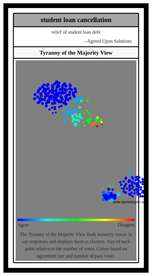 The Tyranny of the Majority View finds minority voices in our responses and displays them as clusters. Size of each point relative to the number of votes. Colors based on agreement rate and number of pass votes.