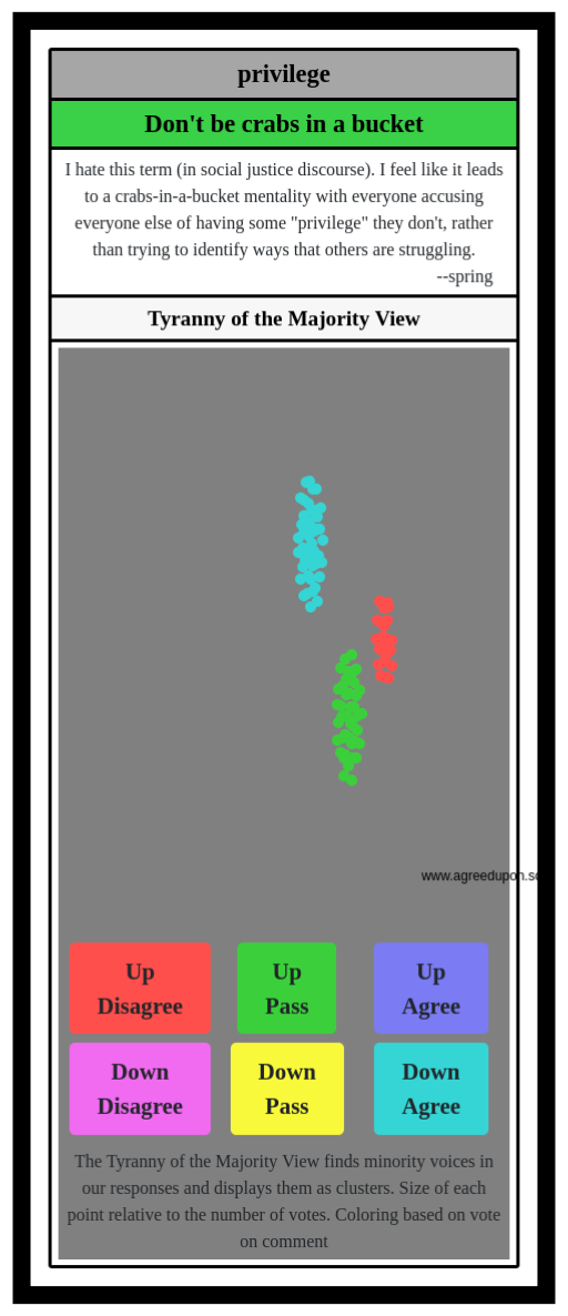 The Tyranny of the Majority View finds minority voices in our responses and displays them as clusters. Size of each point relative to the number of votes. Coloring based on vote on comment