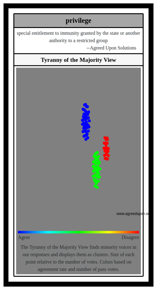 The Tyranny of the Majority View finds minority voices in our responses and displays them as clusters. Size of each point relative to the number of votes. Colors based on agreement rate and number of pass votes.