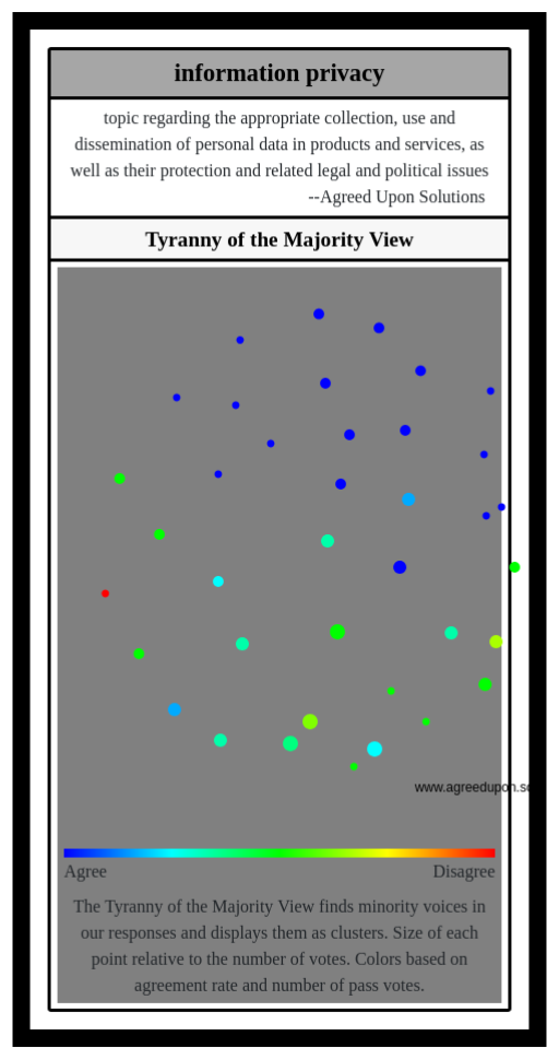 The Tyranny of the Majority View finds minority voices in our responses and displays them as clusters. Size of each point relative to the number of votes. Colors based on agreement rate and number of pass votes.