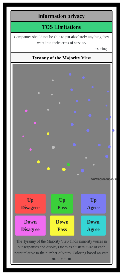 The Tyranny of the Majority View finds minority voices in our responses and displays them as clusters. Size of each point relative to the number of votes. Coloring based on vote on comment