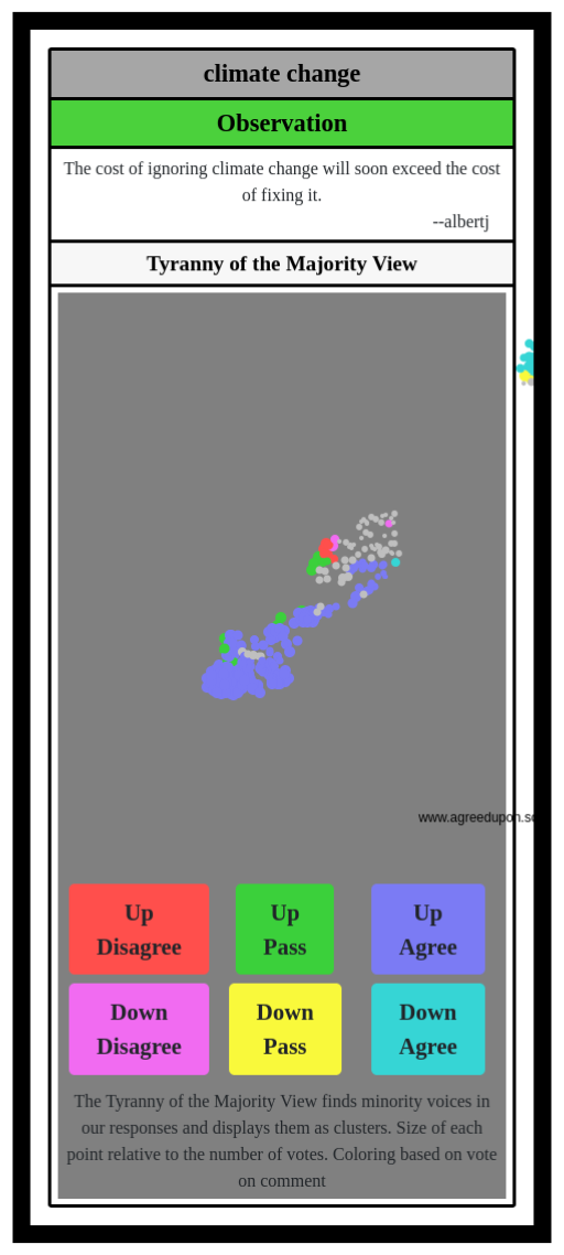 The Tyranny of the Majority View finds minority voices in our responses and displays them as clusters. Size of each point relative to the number of votes. Coloring based on vote on comment