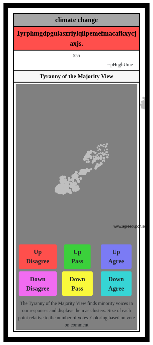 The Tyranny of the Majority View finds minority voices in our responses and displays them as clusters. Size of each point relative to the number of votes. Coloring based on vote on comment