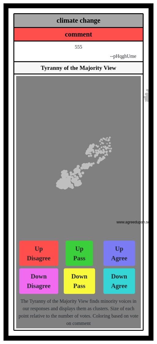 The Tyranny of the Majority View finds minority voices in our responses and displays them as clusters. Size of each point relative to the number of votes. Coloring based on vote on comment