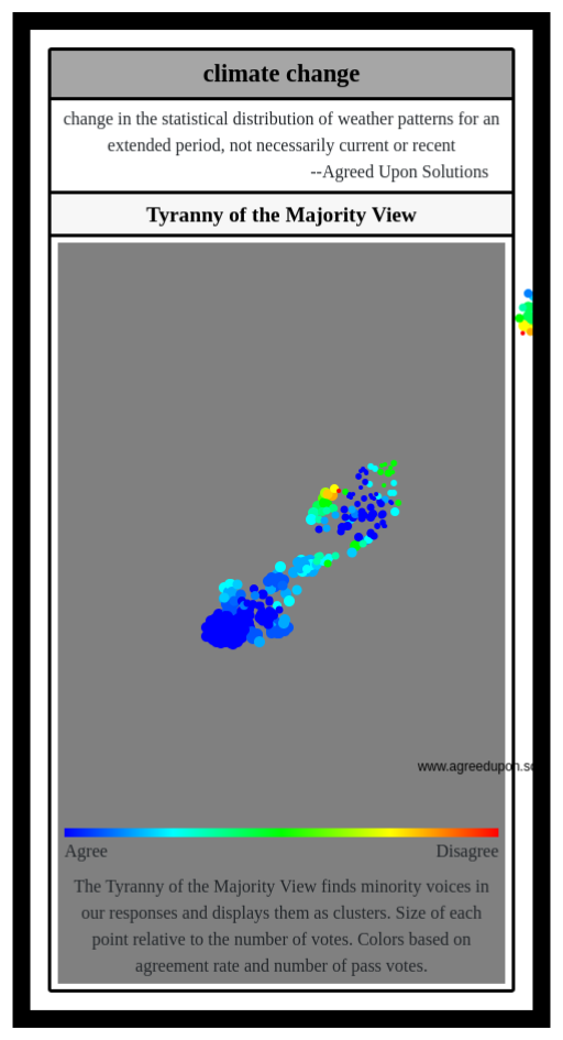 The Tyranny of the Majority View finds minority voices in our responses and displays them as clusters. Size of each point relative to the number of votes. Colors based on agreement rate and number of pass votes.