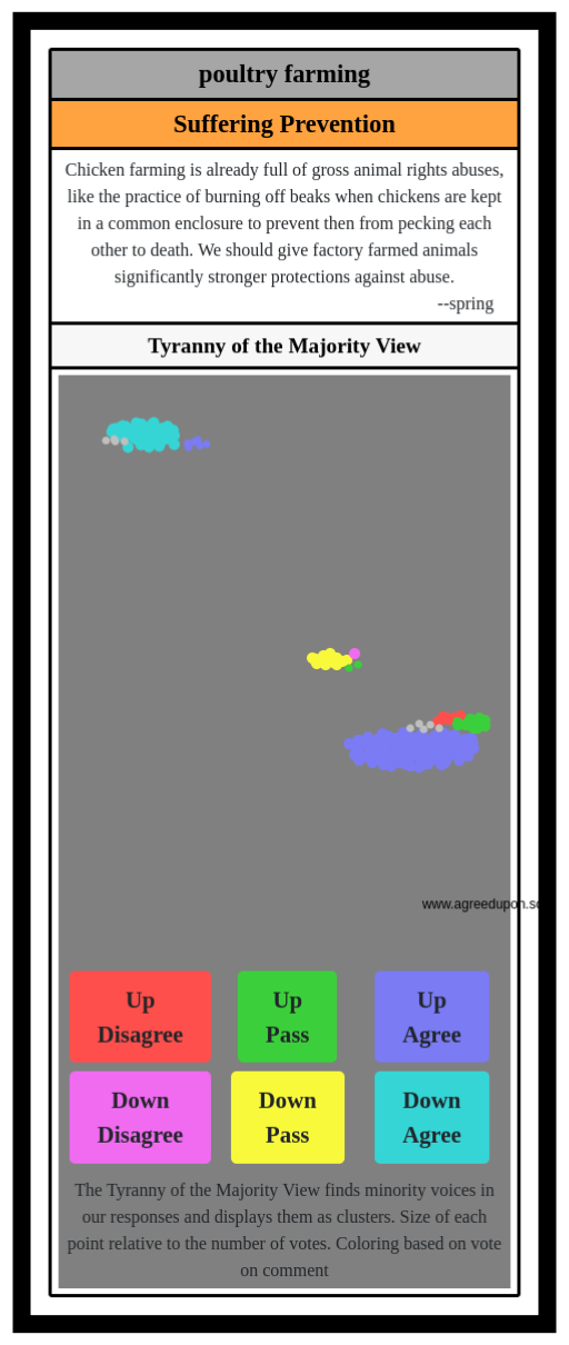 The Tyranny of the Majority View finds minority voices in our responses and displays them as clusters. Size of each point relative to the number of votes. Coloring based on vote on comment