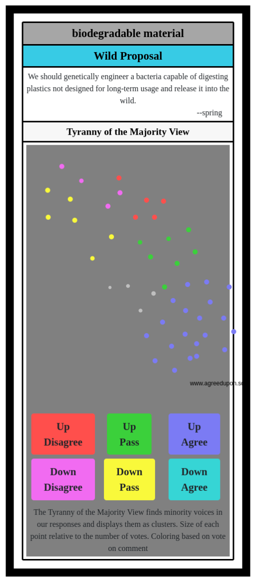 The Tyranny of the Majority View finds minority voices in our responses and displays them as clusters. Size of each point relative to the number of votes. Coloring based on vote on comment
