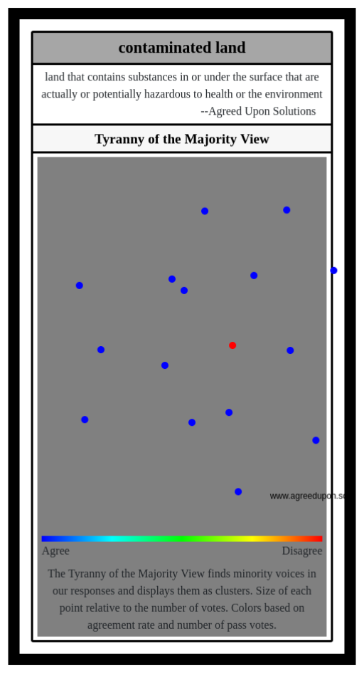 The Tyranny of the Majority View finds minority voices in our responses and displays them as clusters. Size of each point relative to the number of votes. Colors based on agreement rate and number of pass votes.