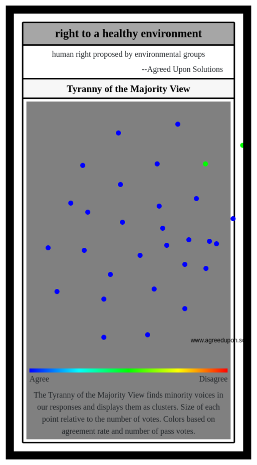 The Tyranny of the Majority View finds minority voices in our responses and displays them as clusters. Size of each point relative to the number of votes. Colors based on agreement rate and number of pass votes.