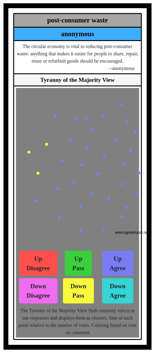 The Tyranny of the Majority View finds minority voices in our responses and displays them as clusters. Size of each point relative to the number of votes. Coloring based on vote on comment