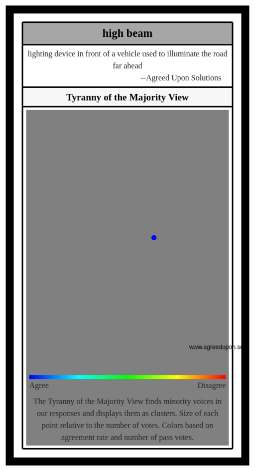The Tyranny of the Majority View finds minority voices in our responses and displays them as clusters. Size of each point relative to the number of votes. Colors based on agreement rate and number of pass votes.