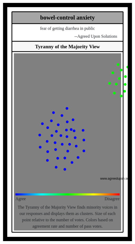 The Tyranny of the Majority View finds minority voices in our responses and displays them as clusters. Size of each point relative to the number of votes. Colors based on agreement rate and number of pass votes.