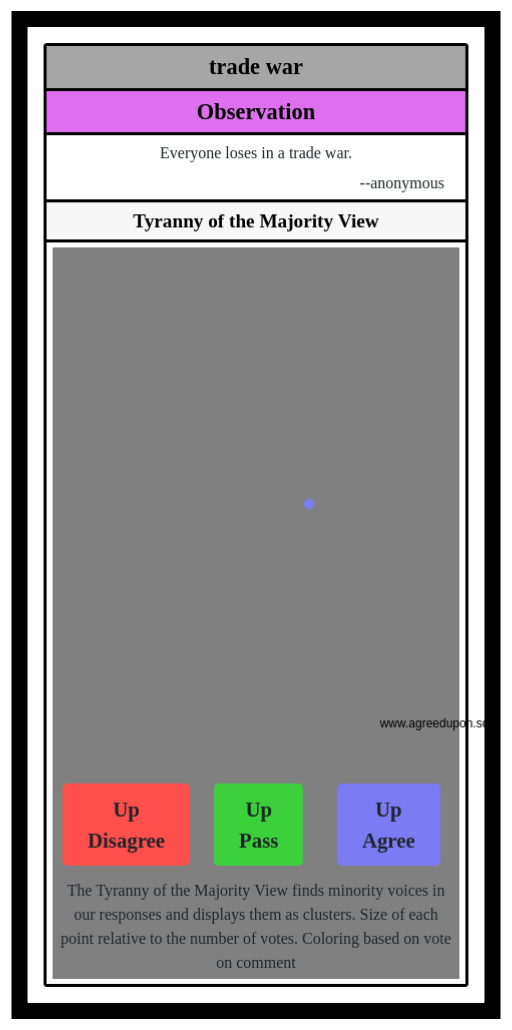 The Tyranny of the Majority View finds minority voices in our responses and displays them as clusters. Size of each point relative to the number of votes. Coloring based on vote on comment