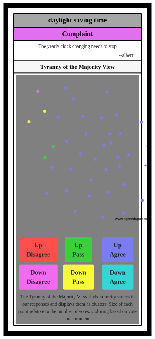 The Tyranny of the Majority View finds minority voices in our responses and displays them as clusters. Size of each point relative to the number of votes. Coloring based on vote on comment