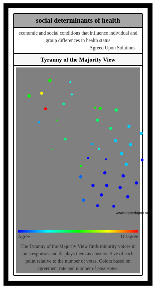 The Tyranny of the Majority View finds minority voices in our responses and displays them as clusters. Size of each point relative to the number of votes. Colors based on agreement rate and number of pass votes.