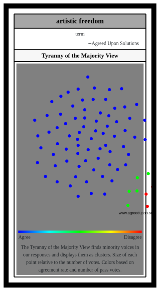 The Tyranny of the Majority View finds minority voices in our responses and displays them as clusters. Size of each point relative to the number of votes. Colors based on agreement rate and number of pass votes.