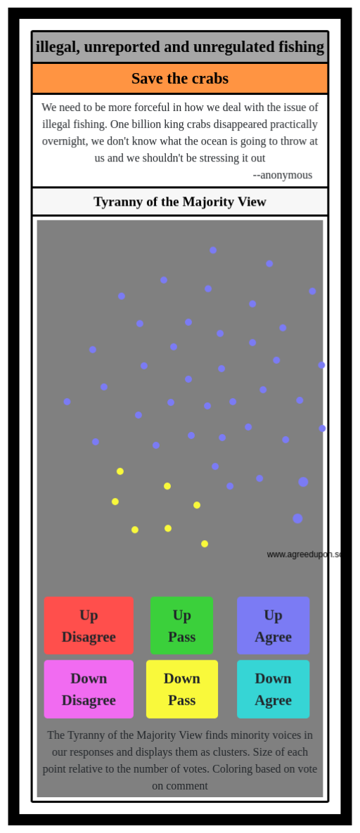 The Tyranny of the Majority View finds minority voices in our responses and displays them as clusters. Size of each point relative to the number of votes. Coloring based on vote on comment