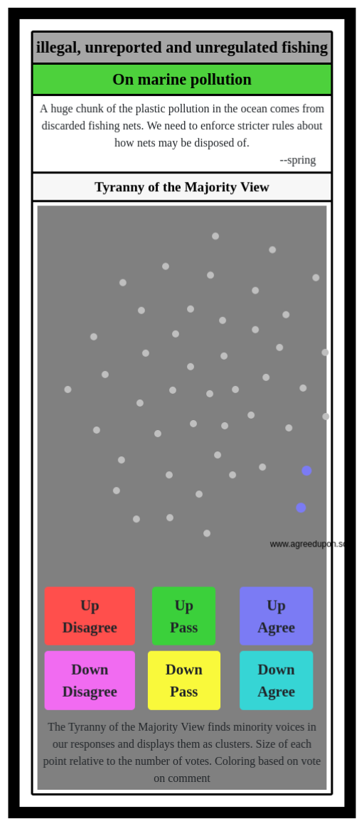 The Tyranny of the Majority View finds minority voices in our responses and displays them as clusters. Size of each point relative to the number of votes. Coloring based on vote on comment